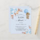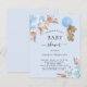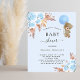 For a modern boho style baby shower. Light blue background colour. Decorated with light blue florals, roses, pampas grass and a teddy bear boy holding a blue balloon. Personalise and add a name and party details.