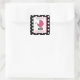 A baby shower sticker featuring an illustration of a pink baby carriage over a background of black with white polka dots. Personalise with your name.