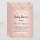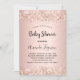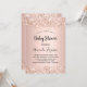 For a baby shower, celebrating a baby girl. A rose gold faux metallic looking background. Decorated with rose gold, pink faux glitter. Personalise and add the mum to-be's name and party details. The name and the text: Baby Shower are written with a hand lettered style script