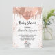 For a baby shower, celebrating a baby girl. A chic white background. Decorated with rose gold, pink faux glitter drips, paint dripping look, balloons and a cute little baby elephant girl. Personalise and add the name of the mum to-be's name and party details. The name and the text: Baby Shower are written with a hand lettered style script