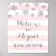 Welcome to the Baby Shower sign poster with custom name in pink and white stripes pattern with silver snowflakes for winter or Christmas.