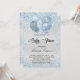 A faux silver metallic looking background. Decorated with blue faux glitter dust and balloons. Personalise and add a name, age and party details. The name is written with a hand lettered style script