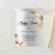 A modern, elegant gender neutral baby shower invitation. Faux silver metallic looking background decorated with golden eucalyptus sprigs. Personalise and add a name and party details. Black coloured letters.