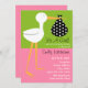 A baby shower invitation featuring an illustration of a stork carrying a black bundle with white polka dots. Background is green on top half and pink on bottom half. Personalise the text with details of your occasion.