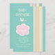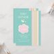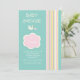 This cute, teal background shower invitation, with a border of pastel-coloured stripes, features a stork and a pink cloud for a name or date.