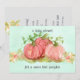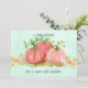 A baby shower for a sweet little pumpkin invitation decorated with a harvest patch of pink porcelain style pumpkins in a bed of autumn leaves and roses on a mint green watercolor wash background. On the back is a light shade of grey, some pastel roses, and text you can edit to fit your needs.