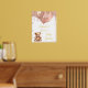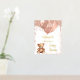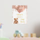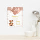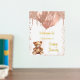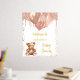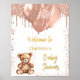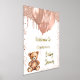 A welcome poster for an elegant and modern baby shower. A white background, a teddy bear holding rose gold coloured balloons. Personalise and add a name. Text: real gold foil.