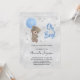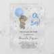 For a baby shower celebrating a baby boy. A faux silver metallic looking background. A teddy bear holding a blue balloon stars and faux glitter dust. Personalise and add the name of the mum to-be and party details. The name and the text: Oh Boy! are written with a hand lettered style script