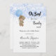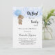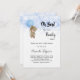 For a baby shower celebrating a baby boy. A white background. A teddy bear holding a blue balloon. Personalise and add the name of the mum to-be and party details. The name and the text: Oh Boy! and Bearly are written with a hand lettered style script.