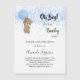 For a baby shower celebrating a baby boy. A white background. A teddy bear holding a blue balloon. Personalise and add the name of the mum to-be and party details. The name and the text: Oh Boy! and Bearly are written with a hand lettered style script.