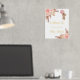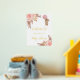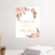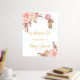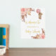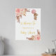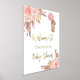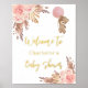 A welcome poster for an elegant and modern baby shower. A white background, boho style pampas grass, rose gold and blush pink florals and a teddy bear girl holding a pink balloon. Personalise and add a name. Text: real gold foil.