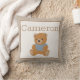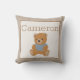 This custom throw pillow features a cute image of a teddy bear with a blue t-shirt. Above the image of the teddy bear is a sample name that you can personalise to include your own baby's or child's name, initials, or custom message or quote. The background colour is a soft beige.