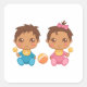 Cute cartoon babies, boy and girl, in blue and pink rompers and yellow bibs holding matching rattles.