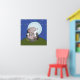 An adorable baby wolf sitting on some rocks howling at a big round full blue moon.