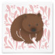 Cute baby wombat on a background of pale pink eucalyptus leaves and gumnuts.