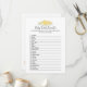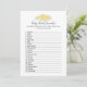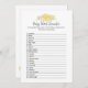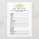 A fun game for the gender reveal party is the Baby word scramble. This game card features yellow florals at the top. On the reverse is a teddy bear leaning on a honey barrel watching a honey bee with templates.