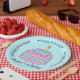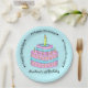 These turquoise blue Happy Birthday cake paper party plates are great for celebrating a first 1st birthday or any birthday. The plates are personalised with the name and "1st birthday", all customisable. The whimsy art features pink and turquoise birthday cake with one candle on a turquoise blue aqua background plate. The words “Happy Birthday” are on 3 side edges of the plate with the custom name and 1st birthday at the bottom. These plates are easy to customise for a cute and fun birthday party!