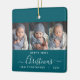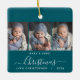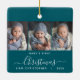 Help them commemorate their grandchild's first Christmas with this beautiful modern keepsake ornament. The white text reads "Baby's first Christmas," with the word "Christmas" in elegant handwriting script with flourishes before and after on a teal blue background. Replace the three sample images with your favourite vertical photos, and add baby's name and the year.