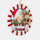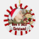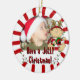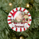A candy cane striped round porcelain ornament with a baby wearing reindeer antlers and holiday lights and text that reads "Have a Jolly Christmas!" that you can easily customise before ordering with a photo and other text.