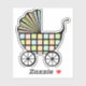 Take a stroll with this fun, stylised pram decorated with bright pink, orange, green, and blue stripes on the cover and a pattern reminiscent of wooden blocks on the body.