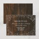 A rustic and elegant wedding reception card featuring a border of baby's breath over a barn wood inspired background.