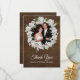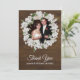Stylish flat style rustic chic wedding themed thank you card, with your custom photo framed by graphics of a floral wreath of baby's breath set on a dark wood background. Personalise the custom white text and replace sample photo with your own. Matching wedding products are available.