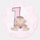 Adorable baby holding a present just for her. Pink scroll background with a big number one!