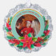 Celebrate a milestone with this stunning personalized photo Christmas ornament! Featuring a gorgeous teal background with sparkling gold accents and a festive wreath of poinsettias, holly, and candy canes, this ceramic ornament is the perfect way to display a treasured photo of your baby in their Santa outfit. Personalize it with the year ("20xx") to commemorate your little one's very First Christmas. A beautiful keepsake for new parents or a thoughtful gift for grandparents.