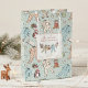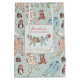 This gender neutral Baby's First Christmas gift bag features a hand-drawn pattern of Christmas baby bodysuits, adorable winter stuffed animals (penguin, reindeer, teddy bear) and bibs hanging on a clothes line with customisable names and event date. The background features a pattern of baby bodysuits, stuffed animals, bibs, bottles, pacifiers and xmas gifts, all against an elegant soft mint green background with scattered cute little stars.