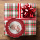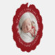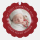 Modern keepsake baby's first Christmas personalize paper ornament in curve letters and line art of snowflakes overlaying a festive red with your favorite photo.