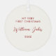 Celebrate your little one’s first Christmas with this timeless keepsake ornament, featuring a minimalist design accented by a charming hand drawn bow detail. The clean layout and soft tones of ivory and cranberry red create a warm, elegant look that complements any holiday décor. Personalize with your baby’s name and year on the back to create a treasured memento for your tree or a thoughtful gift for new parents. Style notes: • “My Very First Christmas” message on back with customizable name and year • Modern script name paired with classic type for a balanced, refined look • Available in multiple color options to match any holiday palette • Perfect for baby’s first Christmas, new parents, or grandparents