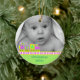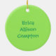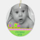 Sweet baby's first Christmas ornament made out of a round shaped ceramic with a pretty gold cord. Graphics of a colourful neon like colours toy train bordering a light green background, at the bottom of the ornament, and a custom photograph, at the top of the ornament. Green text on the bottom area and on the backside is fully customisable. Personalise all the text and the photo of your baby, for a sweet first Christmas or as a lovely gift for the new parents or grandparents.