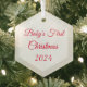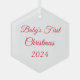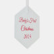 This Christmas glass ornament is shown in the hexagon shape with text: Baby's First Christmas and date in a red colour.