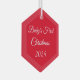 This Christmas glass ornament is shown in the hexagon shape with text: Baby's First Christmas and date in a white colour.
