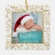 Celebrate baby's first Christmas with this beautiful keepsake ornament. Easily replace the sample image with your own favorite photo and customize it with baby's name in white handwriting font and the year below. (The design works best with photos that have a dark background in the lower area.) The photo is framed by an elegant square frame decorated with hand-drawn gold foliage on a white background.