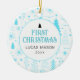 Baby's First Christmas holiday ornament design. Christmas tree, greenery, snowflake baby blue pattern with space for babies name, year and your favourite photo on the back.