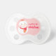 Adorable baby's 1st Christmas pacifier with custom text for baby's first name. Features a cute snowman wearing a striped hat and scarf. Great holiday gift item for mothers of a newborn baby girl. Pink, red and white colours.