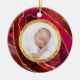 This beautiful ornament features a dark red painted geode look, with many elegant gold accents. The centre of the ornament features your newborn baby's photo, with text that says "Baby's First Christmas," plus room for their name and birthdate. There is room for two of your baby's photos.