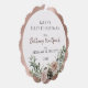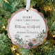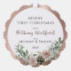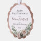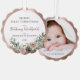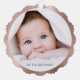Fun Baby's First Christmas Keepsake and Birth Announcement Paper Ornament Card for Family and Friends... A lovely bouquet of pink roses, pine cones, and holiday season botanicals decorates the rose gold metallic frame circling the text on front of our Baby's First Christmas ornament card for the family and friends of new parents. On back of the ornament card is the baby's photo also framed by metallic rose gold with a greeting from the baby herself: Example text reads "Hi. I'm Bethany". All example text and the placeholder photo can be easily revised with your own on the personalization template. Envelopes are available also.