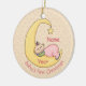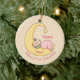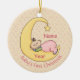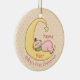 This precious ornament has a baby girl sound asleep on the curve of the moon. There's a star above her. Background is pale yellow with tiny pink hearts. Ornament says "Baby's first Christmas" and you can personalise it with your baby's name and the year.