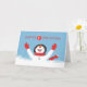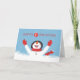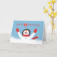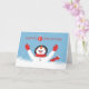 A snowman is reaching up delighted with the snow. Perfect card to send on a baby’s first Christmas! The snowman is bundled up in red mittens and scarf.