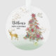 PERSONALIZE Christmas round ornament commemorating Baby's First Christmas. You can customize the Name of the Baby, The year of baby's birth and on the back "Now We Are "number". The are gold sparkles and faux glitter on the tree. The front has a PEACE DOVE and a decorated Christmas Tree. The tree has many red poinsettias. There is a faux gold buck deer in the background with a nice rack of antlers. One gift by the tree is waiting to be opened.
