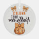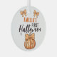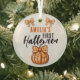 Baby's First Halloween Pumpkin Bow Glass Ornament. A custom baby's name in a trendy script, orange pumpkin with cute bow and orange bow. Personalise the ornament with your baby's name. A lovely Halloween holiday keepsake.