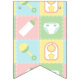 Four squares in soft pastels of pink, green, blue, and yellow are framed by a white design like stitch marks and decorated with cute, baby-themed icons of a bottle, diaper, rattle, and bib. Customise the message on the banner with your soon-to-be little one's gender or a message of your choice to create a truly unique party decoration for your baby shower. This can easily be changed between "boy", "girl", and "baby", and if you're having twins or other multiples, just click the "Customise It" button for more options.