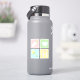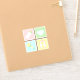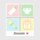 Four squares in soft pastels of pink, green, blue, and yellow are framed by a white design like stitch marks and decorated with cute, baby-themed icons of a bottle, diaper, rattle, and bib.