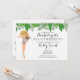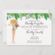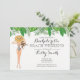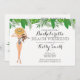 Tropical bachelorette beach party weekend invitation features girl in swimsuit and tropical flowers. Event details on back of invitation. Can be customised for any event.