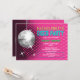 © Socialite Designs Inc. Celebrate the bride-to-be bachelorette party by sending out these fun pink and silver disco ball party invitations. Easily customise the text for your event by replacing the template text. Design incorporates a silver disco ball, pink background with reflections and starbursts that can be moved and resized. The text is made to look like neon lights.