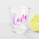 Calligraphy script "drunk in love" quote bachelorette party shot glass favour with the bride's name and party date in ombre pink and purple.