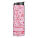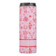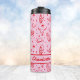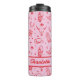 Custom pink and red coastal cowgirl bachelorette thermal tumbler with each of your bridesmaid's names. Design with illustrations of surfboards, cowboy boots, hats, horseshoes, buffaloes, and more.