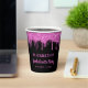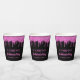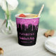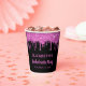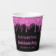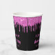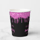 Girly and fun personalised paper cups for your bachelorette party with sparkly hot pink faux glitter dripping down a black background and "Bachelorette Party" in a hot pink script. You can personalise with your name and party date.